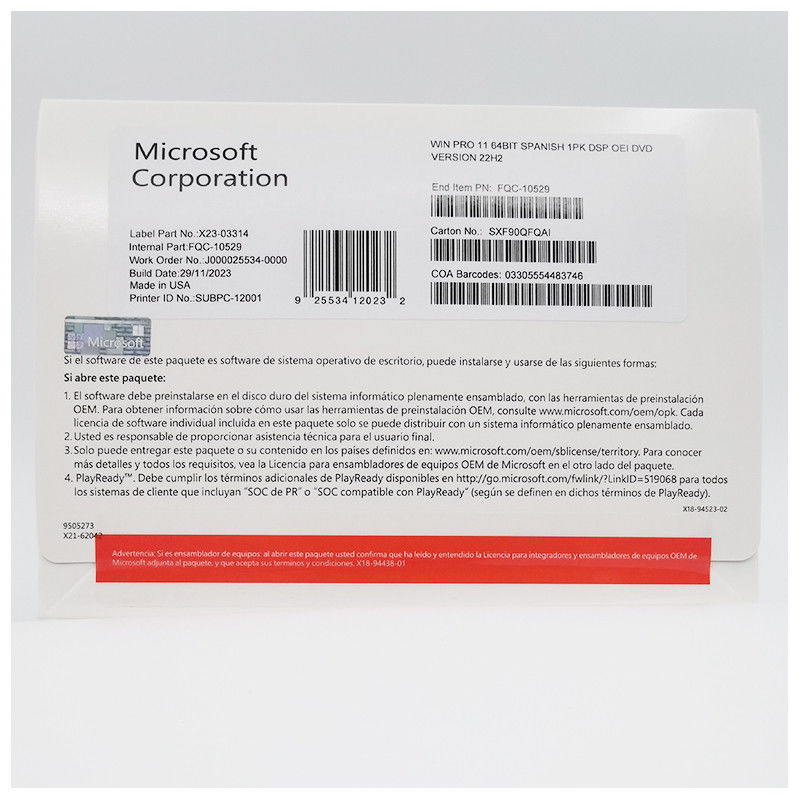 نسخه اصلی ویندوز 11 پرو OEM CD کلید اسپانیایی زبان بسته شامل